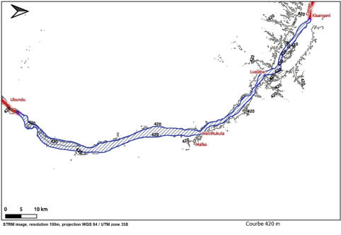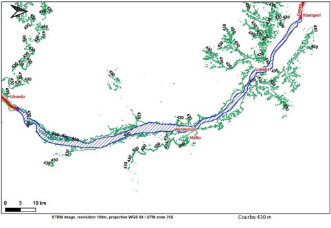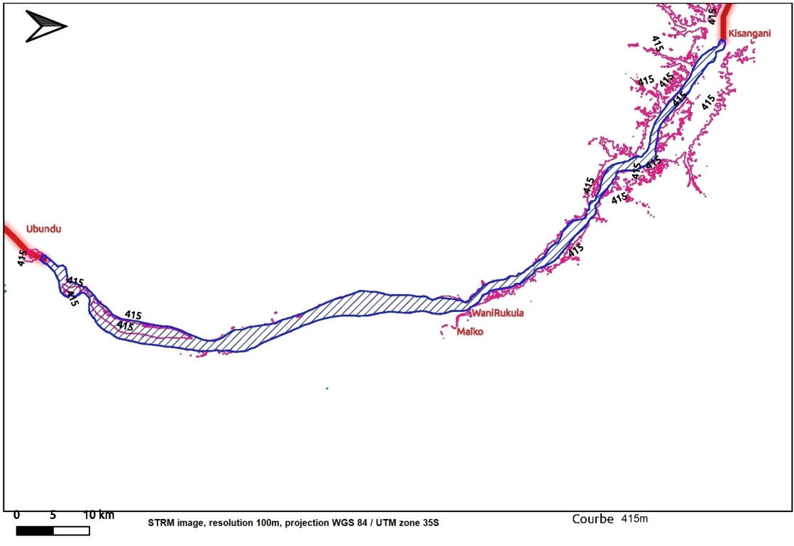 The flooded areas depends on the manometric height of the dam 30m (415-383) 35m (420-383) 40m (425-383) 45m (430-383) (made by Yves Malongo)