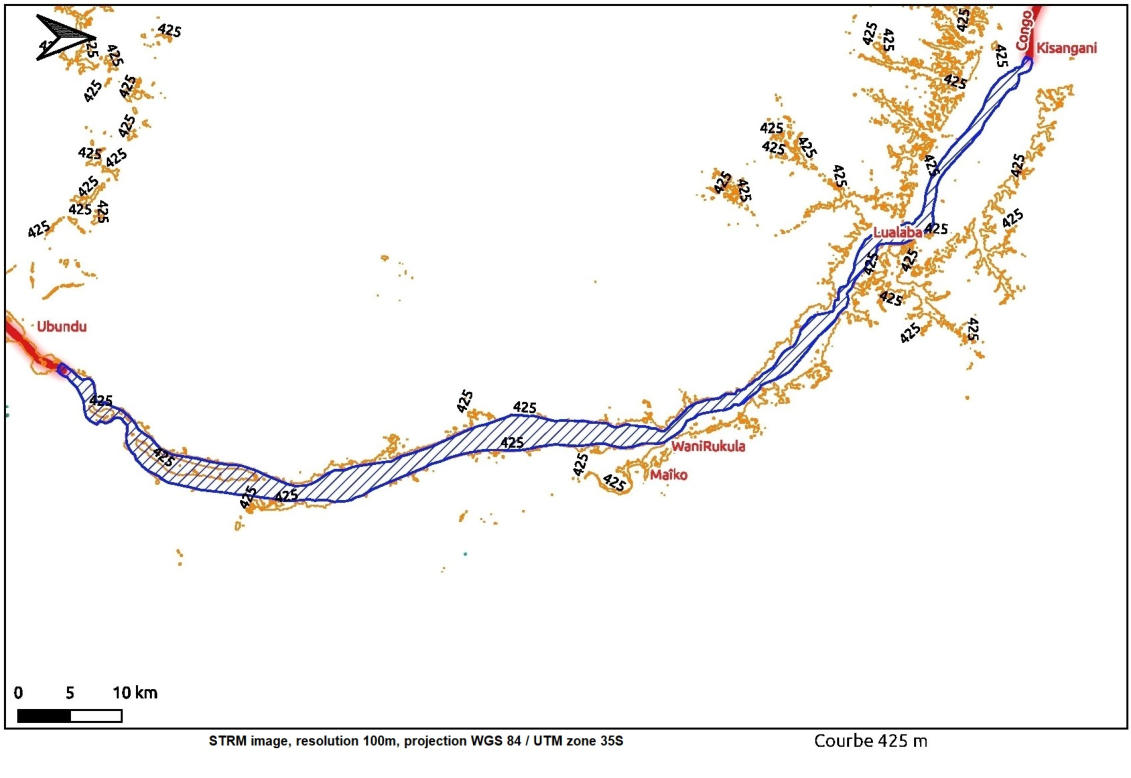 The flooded areas depends on the manometric height of the dam 30m (415-383) 35m (420-383) 40m (425-383) 45m (430-383) (made by Yves Malongo)